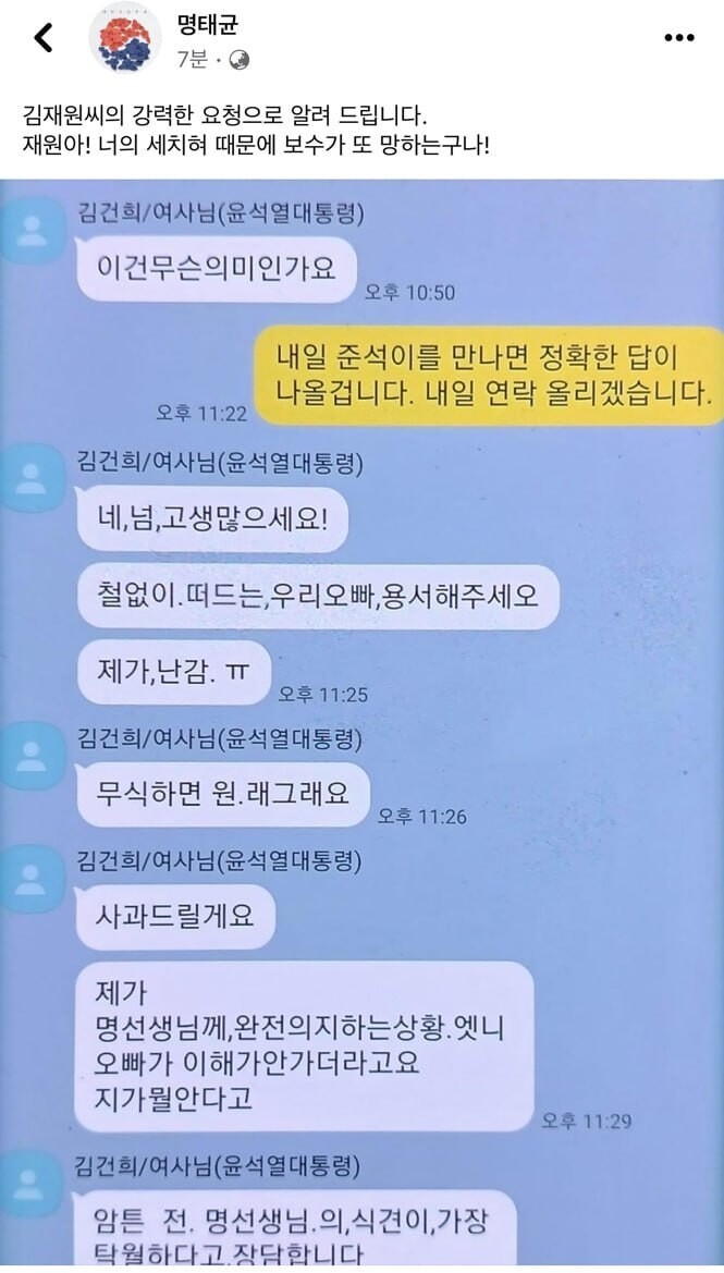이 대화에서 '오빠'라고 언급된 인물이 윤석열 대통령이 아니라 김건희 여사의 친오빠 김진우 씨라는 점을 강조하며, 사적으로 나눈 대화일 뿐이라는 입장도 분명히 했죠.